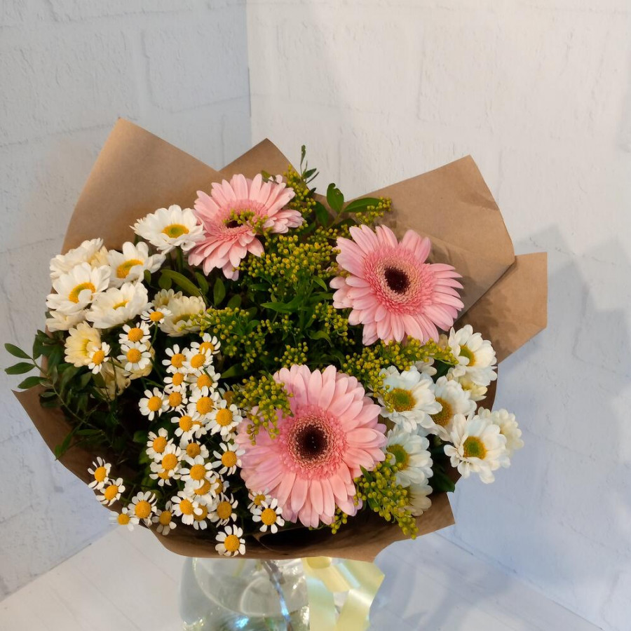 На фото букет «дачное настроение». В составе: гербера 3 шт, хризантема кустовая 2 шт, танацетум 1 шт, солидаго 2 шт, дизайнерская упаковка 1 шт, атласная лента 1 шт, . Все цветы свежие и ароматные, букет красиво оформлен и отлично подходит для подарка. Доступна доставка цветов или самовывоз.
